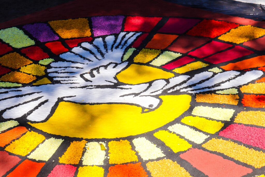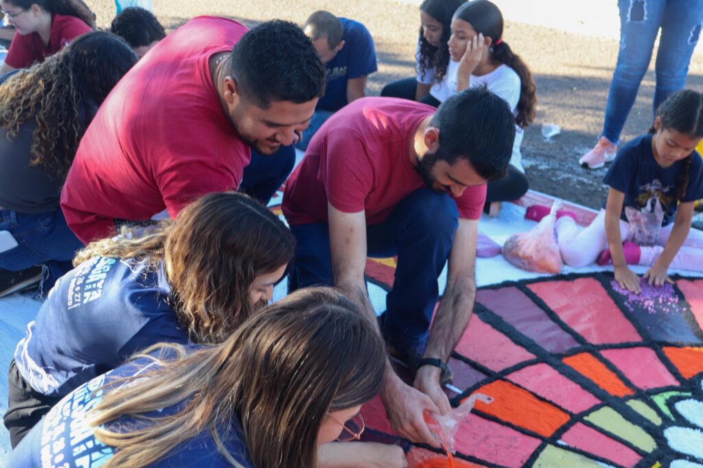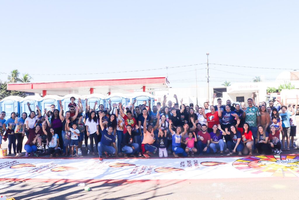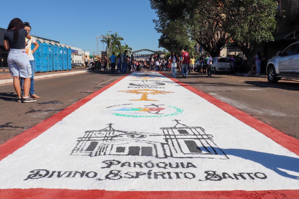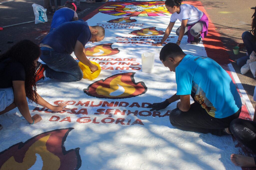 Logo após a missa, membros das comunidades se juntaram aos demais participantes que já estavam dedicados à confecção dos tradicionais tapetes de Corpus Christi, no centro de Campo Grande. Com empenho e criatividade, os fiéis transformaram as ruas da cidade em verdadeiras obras de arte, marcando a preparação para a procissão arquidiocesana. Muitas mãos se uniram, deixando sua marca no percurso que, mais tarde, acolheria o Santíssimo Sacramento.