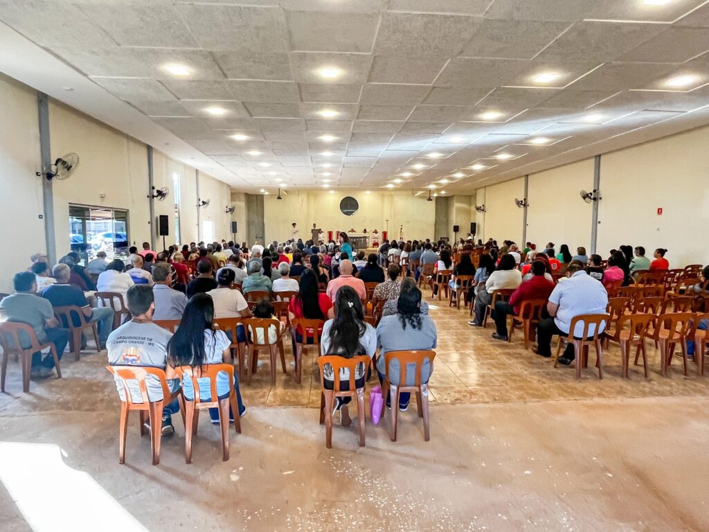 A celebração na matriz paroquial contou com a participação dos fiéis, que também se dedicaram à confecção dos tapetes em sintonia com a programação da Arquidiocese de Campo Grande